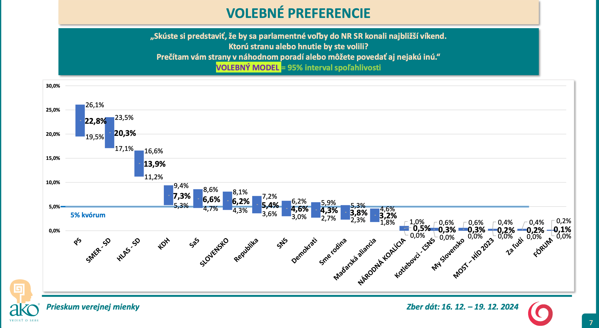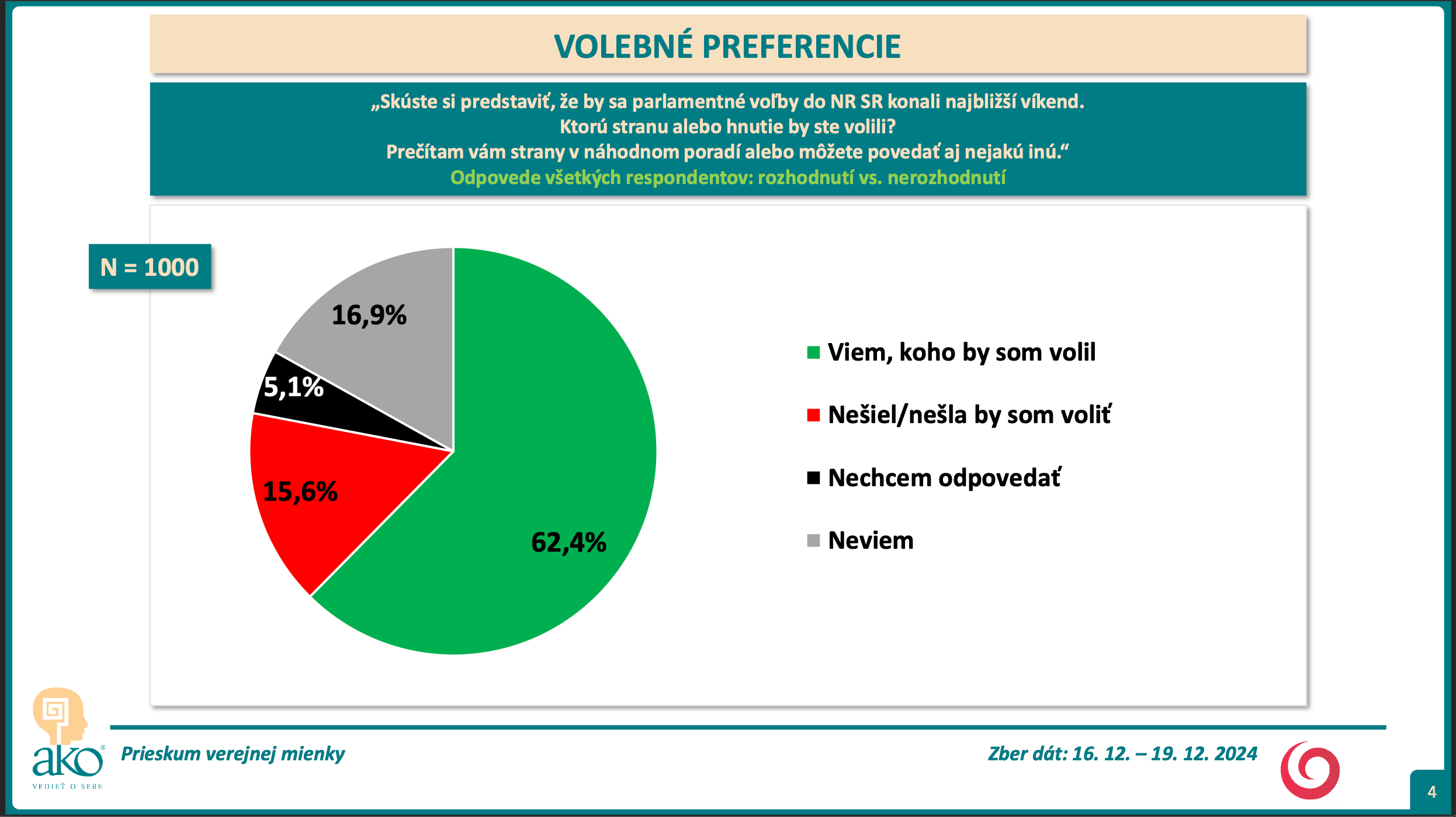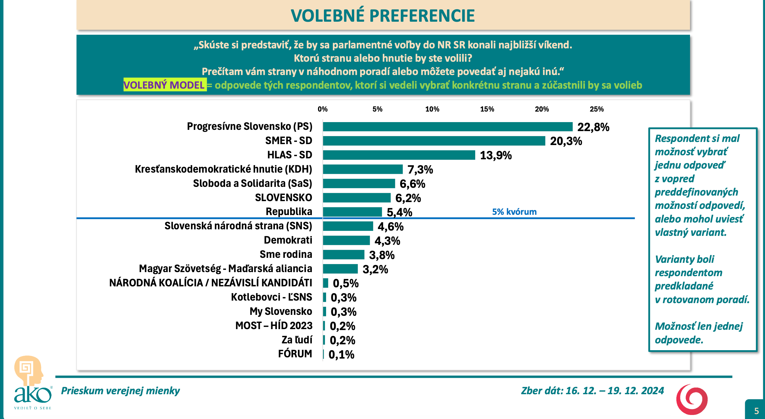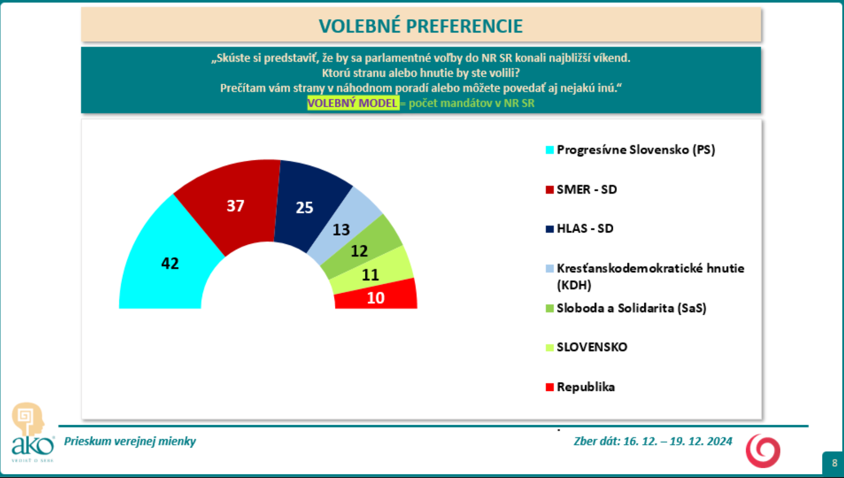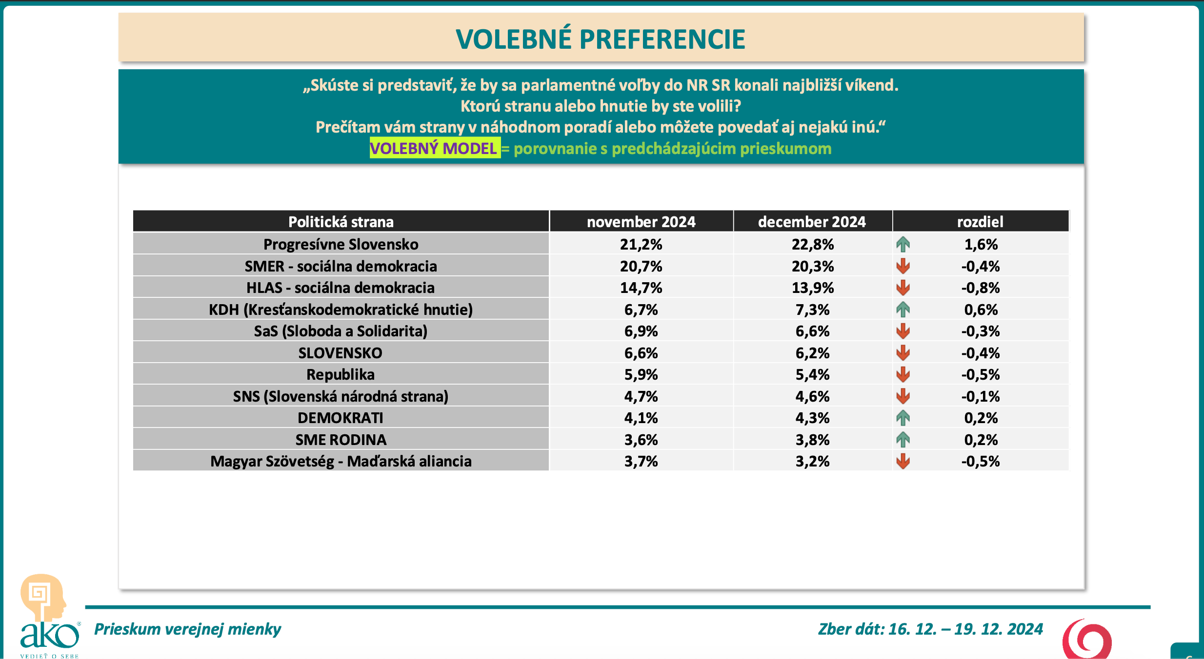 Agentúra AKO robila telefonický prieskum na vzorke tisíc ľudí starších ako 18 rokov v dňoch 16. – 19. decembra 2024. Respondenti neboli oboznámení s tým, kto je zadávateľ prieskumu.