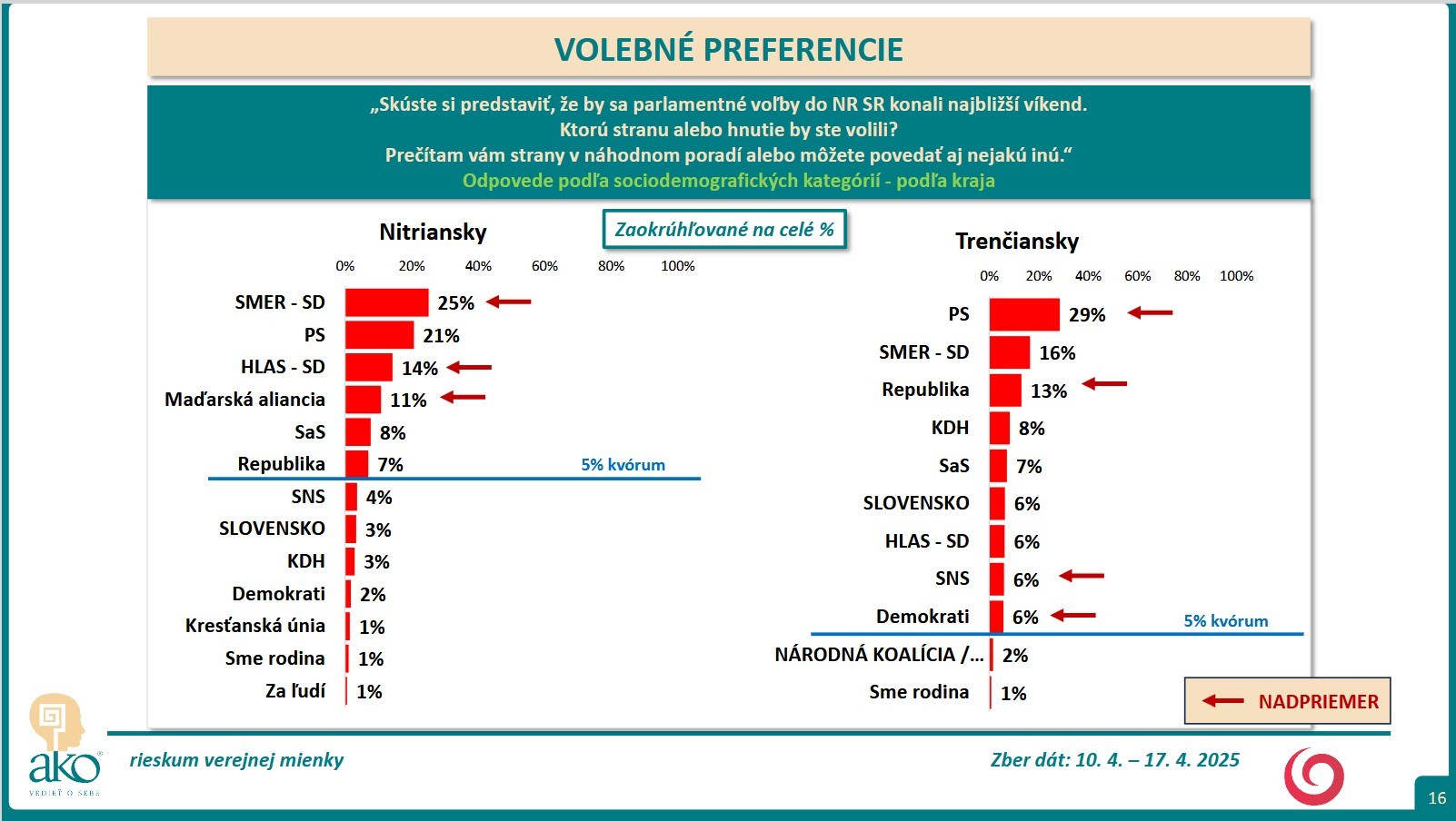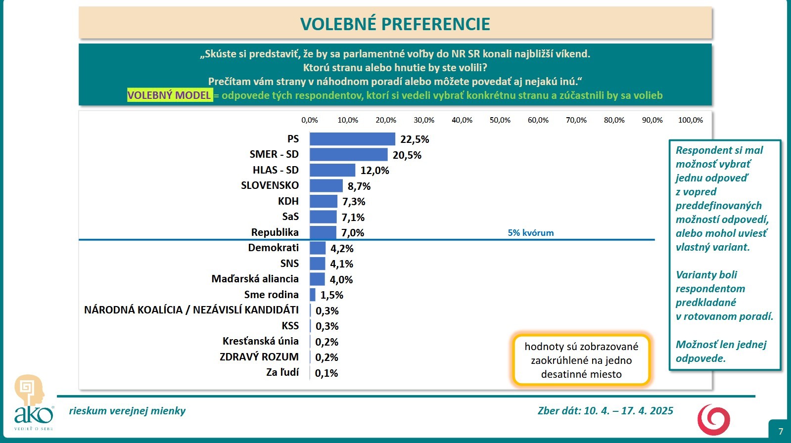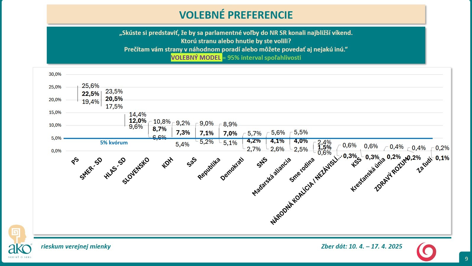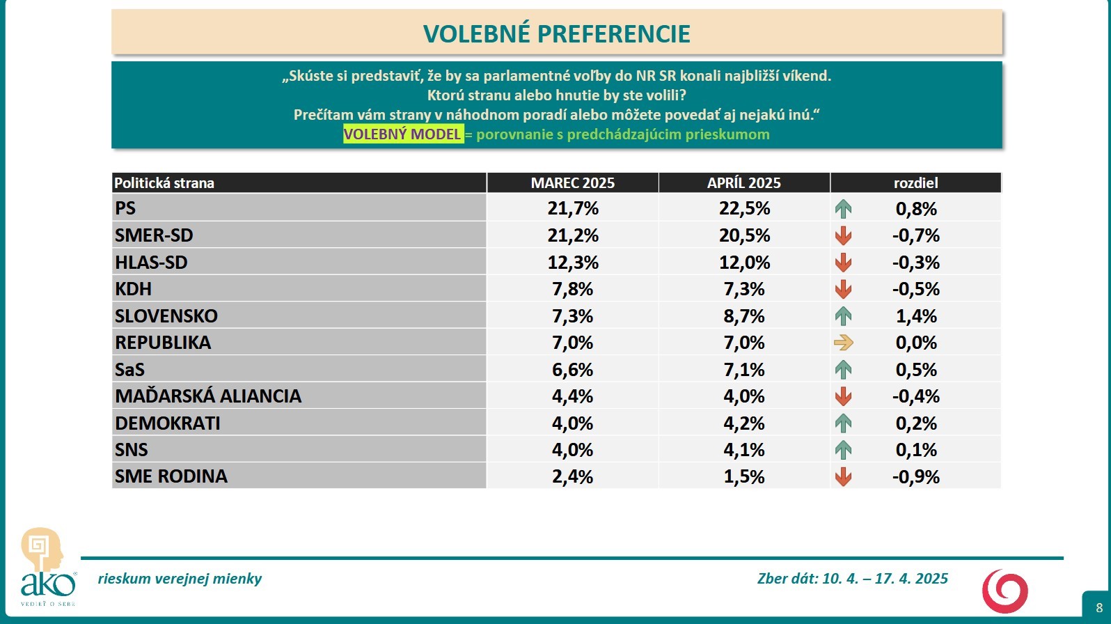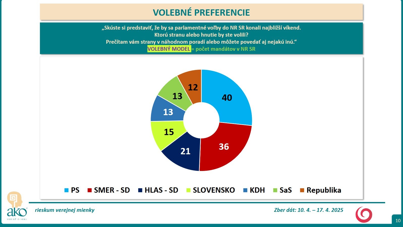 BRATISLAVA / Skúste si predstaviť, že by sa parlamentné voľby do NR SR konali najbližší víkend. Ktorú stranu alebo hnutie by ste volili? Na túto otázku mali odpovedať respondenti, ktorých agentúra AKO oslovila v čase 10. 4. – 17. 4. 2025.