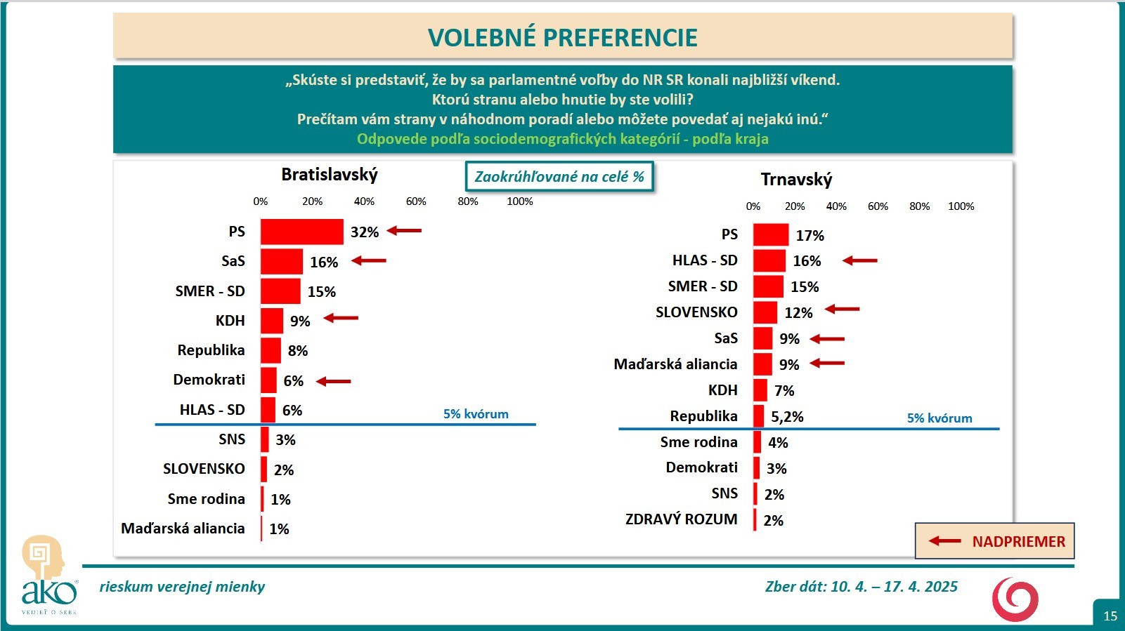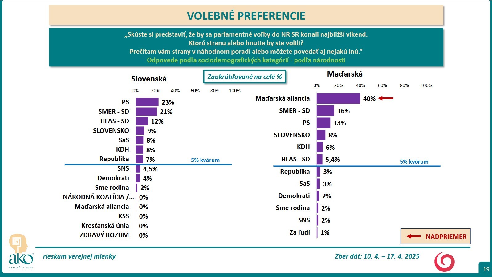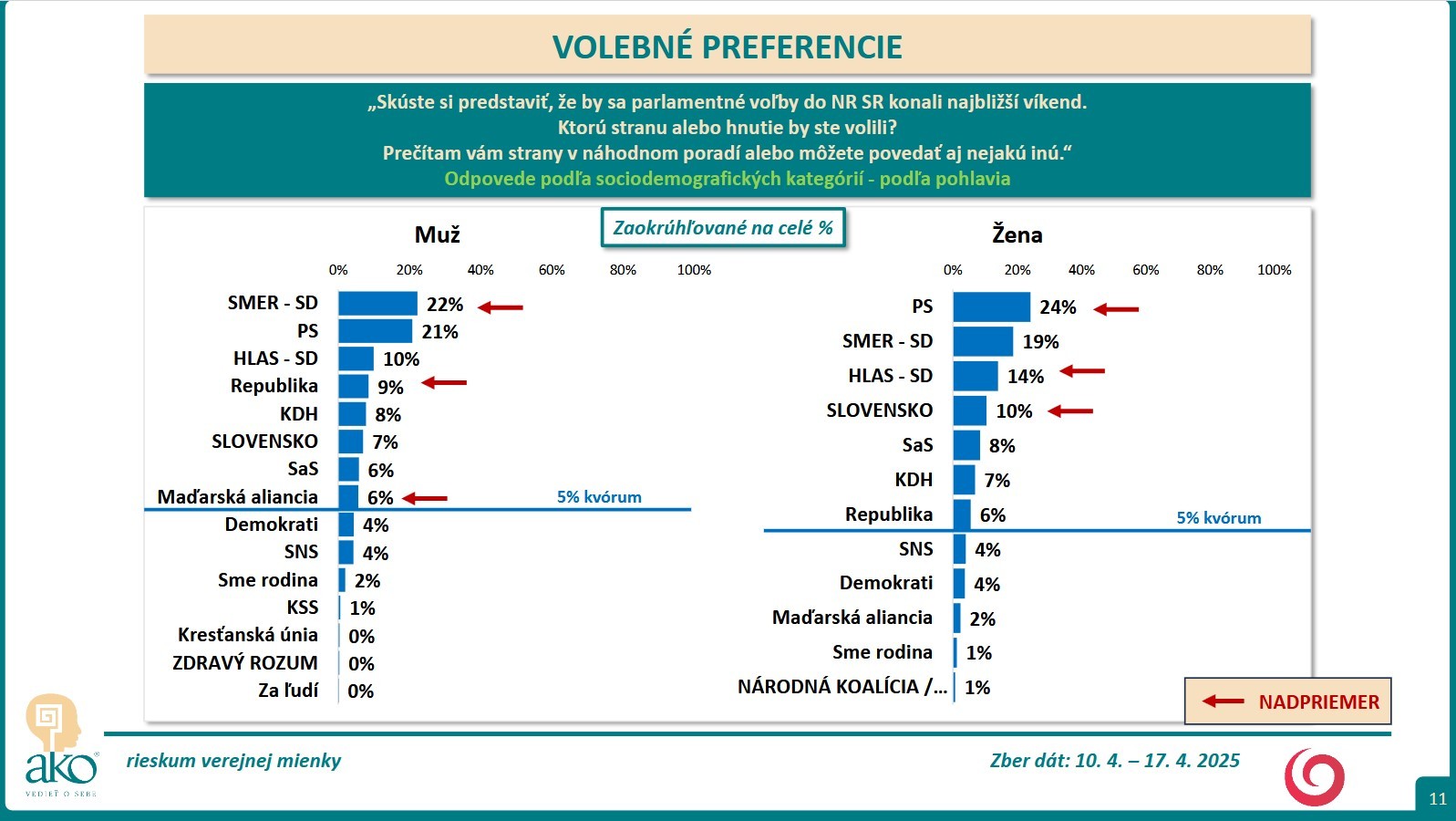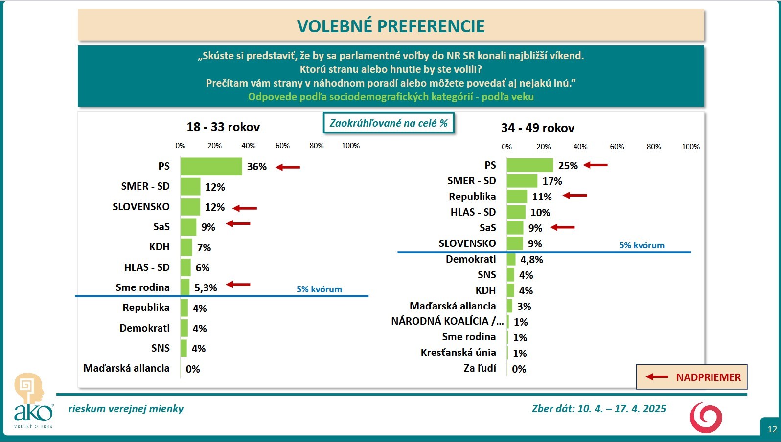 BRATISLAVA / Skúste si predstaviť, že by sa parlamentné voľby do NR SR konali najbližší víkend. Ktorú stranu alebo hnutie by ste volili? Na túto otázku mali odpovedať respondenti, ktorých agentúra AKO oslovila v čase 10. 4. – 17. 4. 2025.