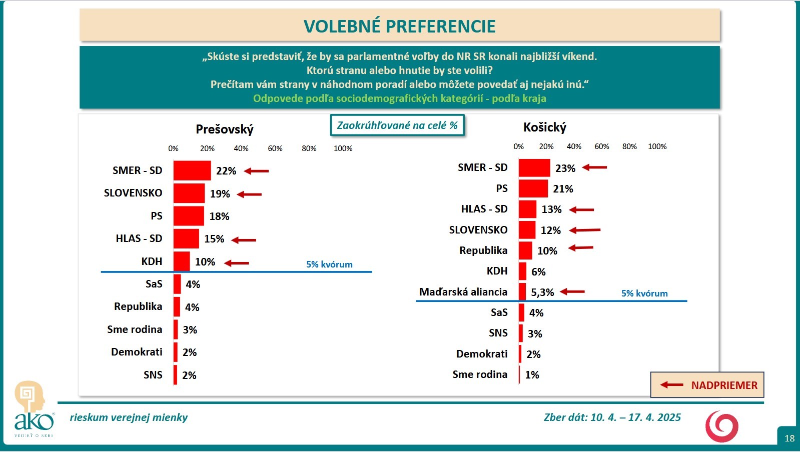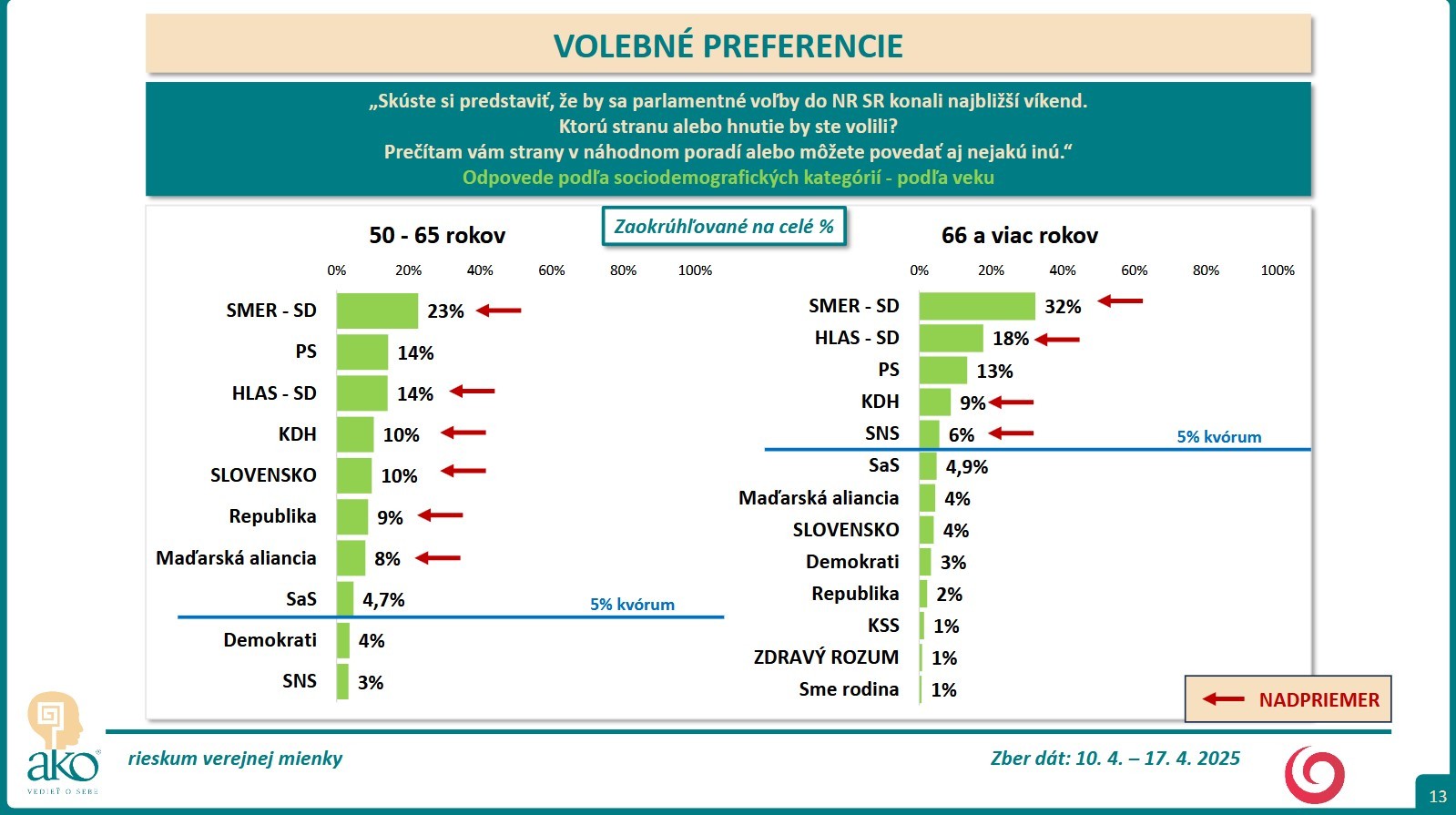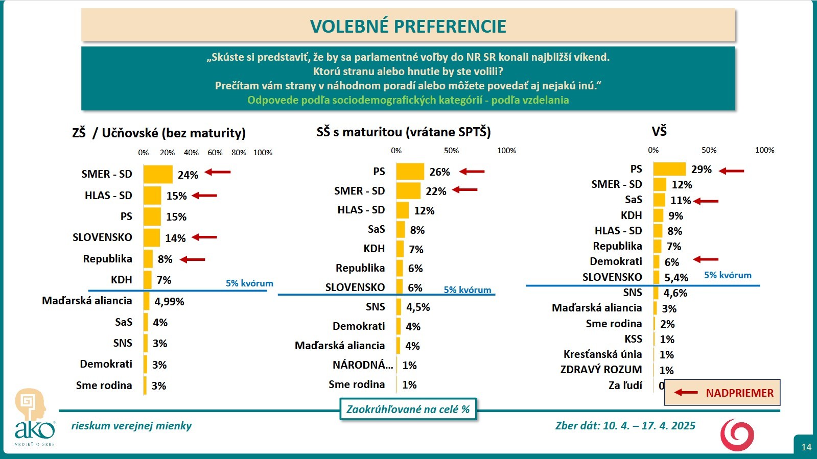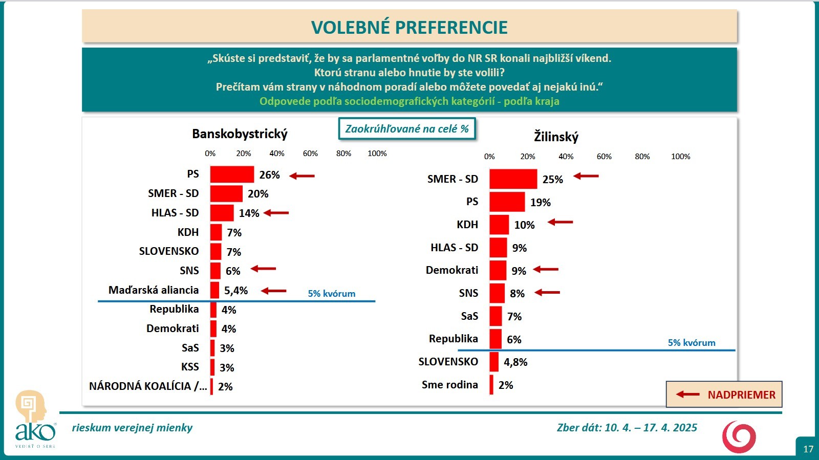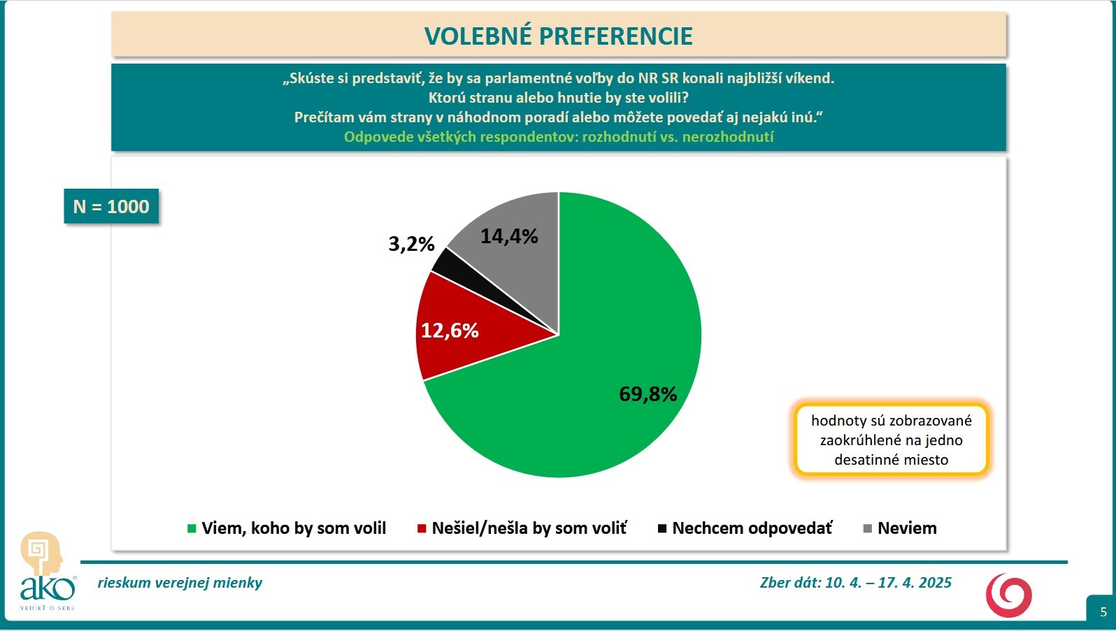 BRATISLAVA / Skúste si predstaviť, že by sa parlamentné voľby do NR SR konali najbližší víkend. Ktorú stranu alebo hnutie by ste volili? Na túto otázku mali odpovedať respondenti, ktorých agentúra AKO oslovila v čase 10. 4. – 17. 4. 2025.