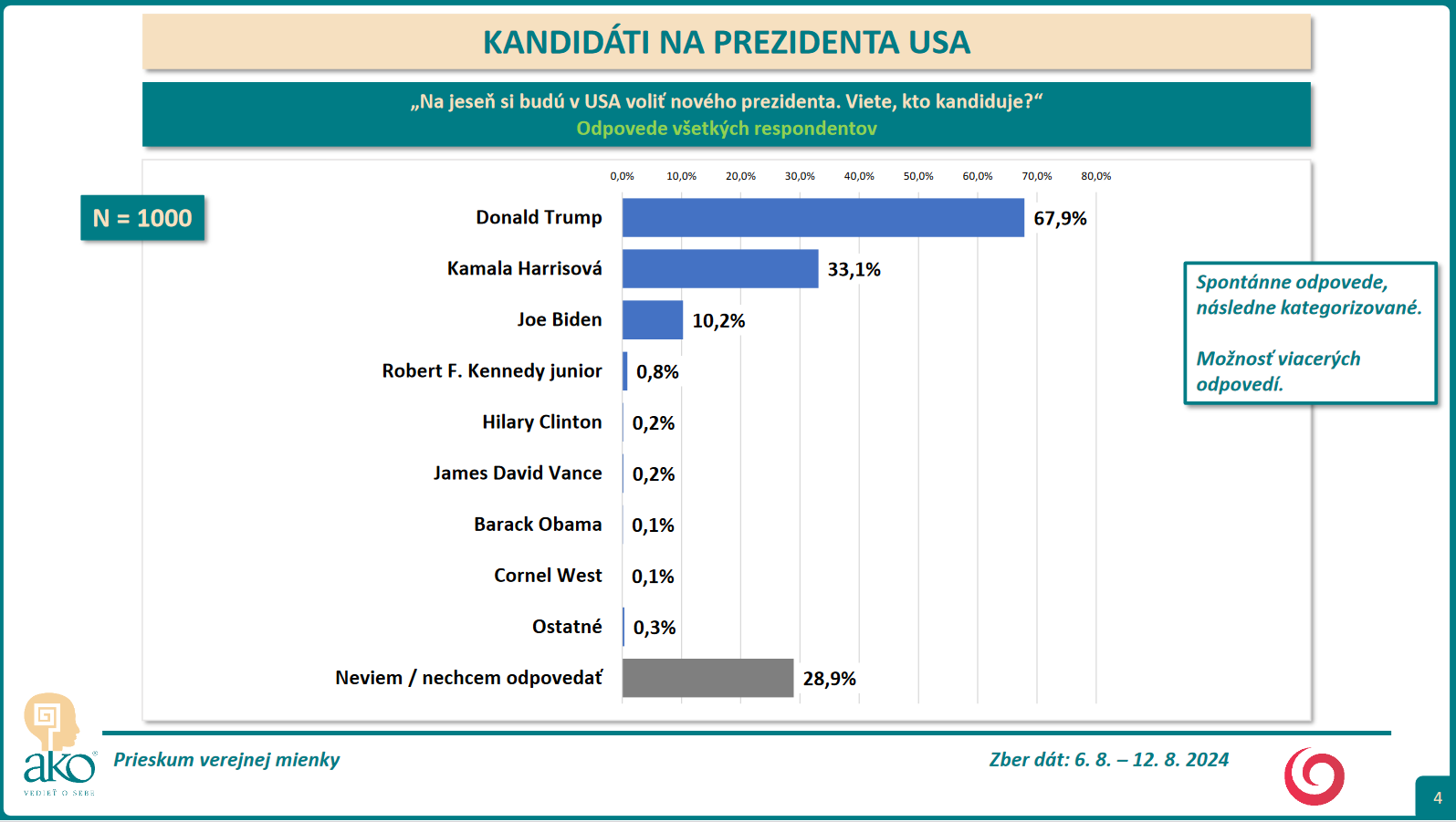 Agentúra AKO robila telefonický prieskum na vzorke tisíc ľudí starších ako 18 rokov v dňoch 6. – 12. augusta 2024. Respondenti neboli oboznámení s tým, kto je zadávateľ prieskumu.